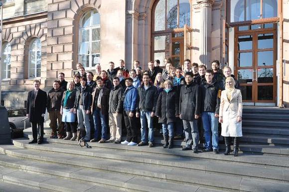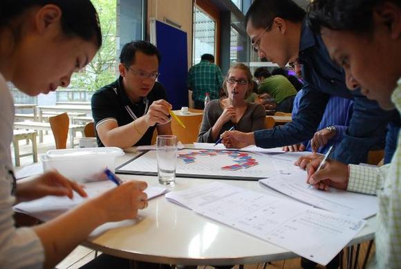 在亚琛工业大学,胡辉(右二)和同学一起做课题研究