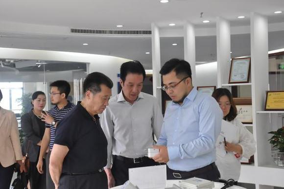 胡辉(右一)为长三角(浙江)民营经济研究会会长、浙江省十一届政协副主席、浙江省原副省长王建满(左一)介绍鲁尔物联自主研发的传感器